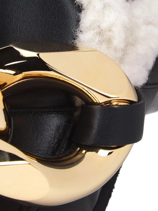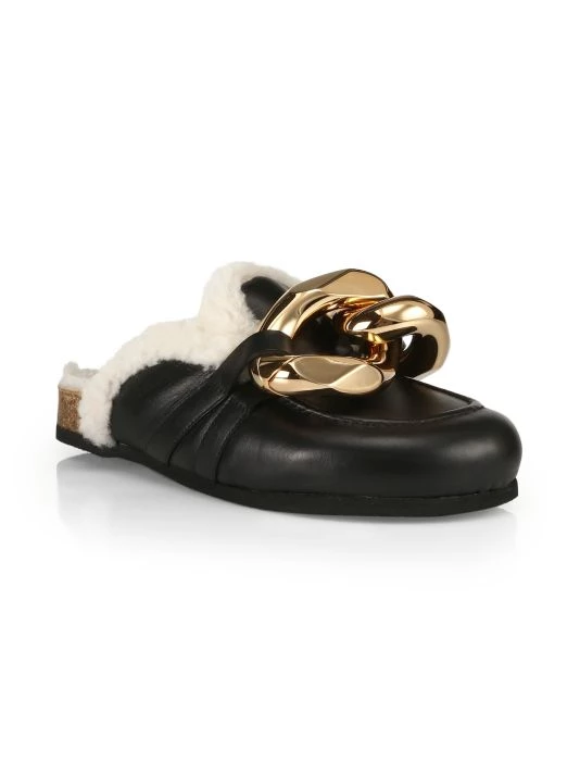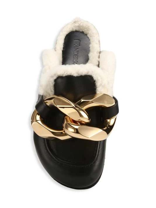An oversized chunky goldtone chain tops these chic leather loafer mules, lined with luscious shearling.