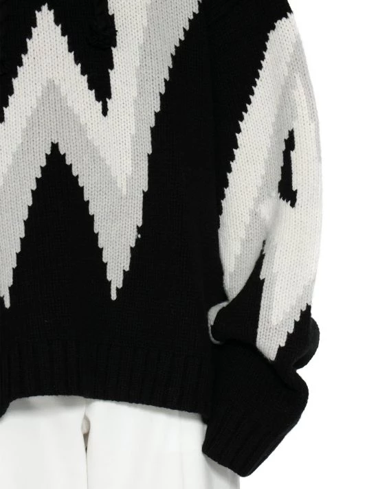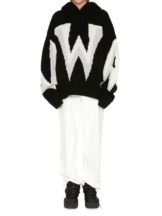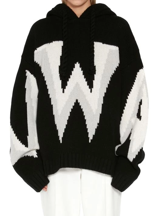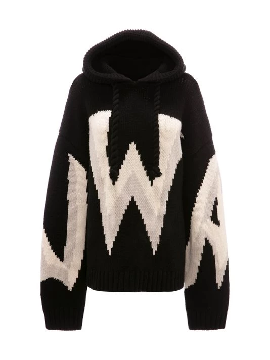 JW Anderson’s collection boasts an abstract take on pandemic-induced life and gender bias with oversized silhouettes, side cutouts, structured asymmetric hems, and rubber and metal embellishments. Almost lacking cohesion, the individual looks are meant to evoke senses of fantasy and play. Cut in an oversized silhouette, JW Anderson’s hooded sweater is defined by large intarsia-knit branding.