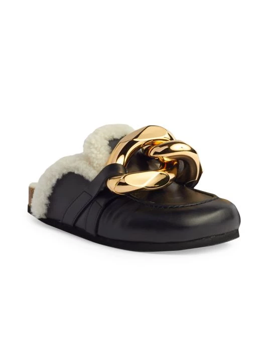 These slides are equal parts cozy and glamorous with a cozy shearling trim and bold chainlink detail.