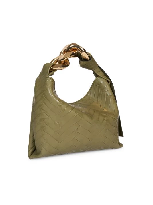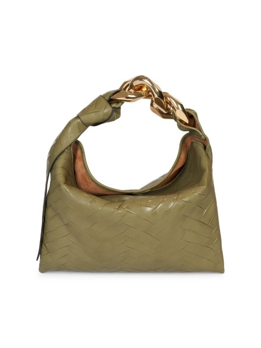 Crafted in Spain, JW Anderson’s hobo bag is made of woven-look faux leather. This top-handle bag boasts a knotted strap with chunky chain links and French seams.
