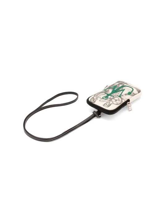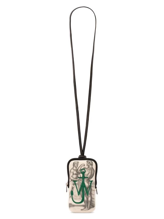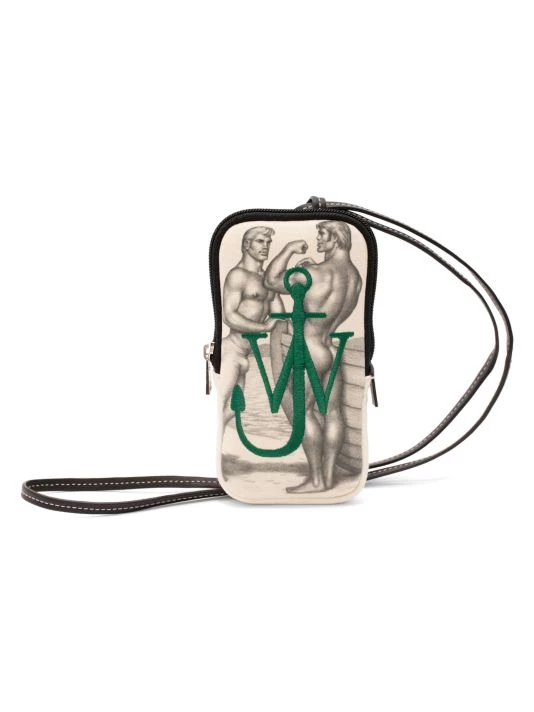 From the JW Anderson x Tom of Finland collaboration. This beautiful crossbody phone pouch is adorned with an intricate artwork motif. A signature JW Anderson monogram logo is embroidered on the face of the piece.